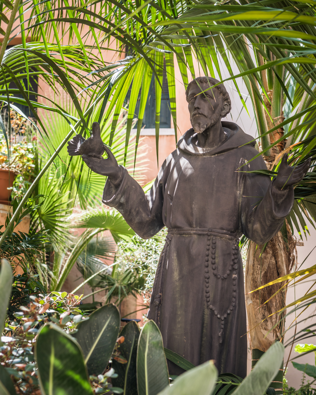 Estatua de San Francisco sosteniendo una paloma en la Catedral Católica de la Asunción de la Santísima Virgen María en Chania, Grecia.